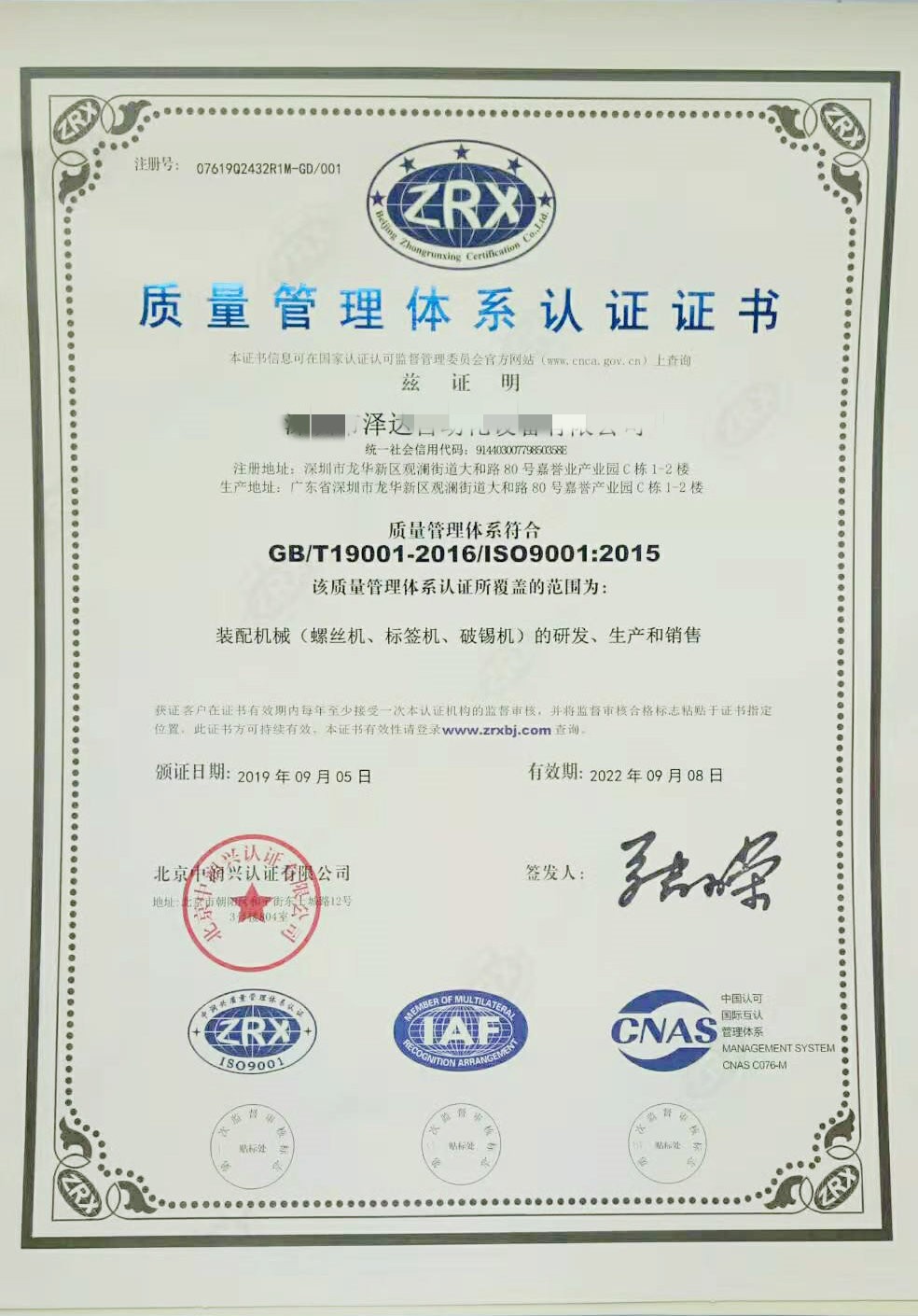 關(guān)于我們已通過ISO9001質(zhì)量管理體系認證